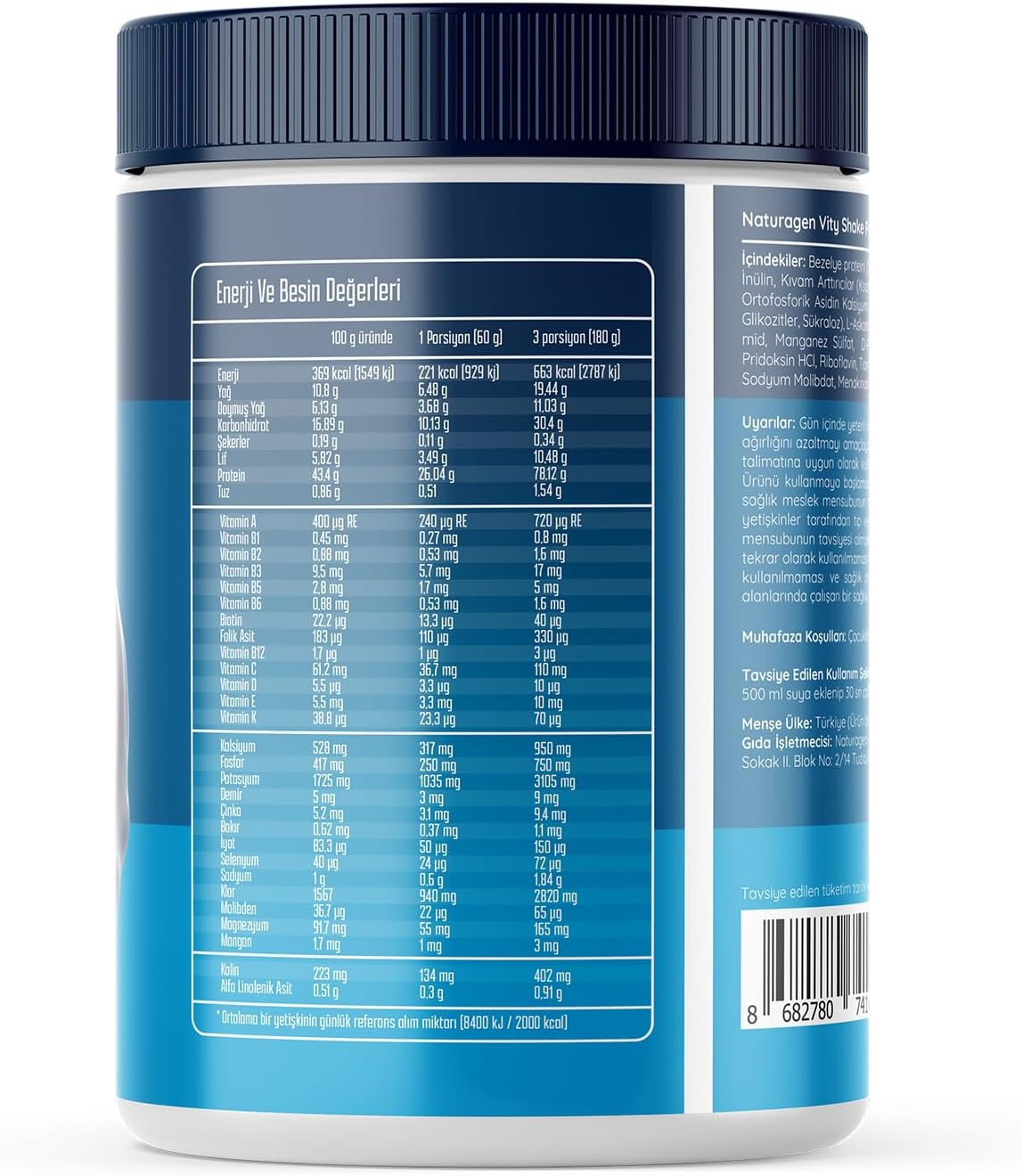 Naturagen Vity Shake Powder یک پودر مکمل وعده غذایی کامل است که بر پایه پروتئین گیاهی نخود، مجموعه‌ای از ویتامین‌ها، مواد معدنی و پری‌بیوتیک اینولین طراحی شده است. با ترکیب کم‌چرب و کم‌قند، این محصول به شما امکان می‌دهد به‌سادگی یک وعده غذایی سبک، سالم و مغذی را جایگزین کنید یا به‌عنوان میان‌وعده مصرف نمایید. تفاوت اصلی این محصول با بسیاری از پودرهای پروتئینی معمول در آن است که نه تنها پروتئین دارد، بلکه مجموعه‌ای گسترده از ویتامین‌ها و پری‌بیوتیک برای سلامت گوارش و جذب بهتر را نیز فراهم آورده. فرم پودر و طعم خوشمزه آن نیز مصرف روزانه را ساده‌تر و جذاب‌تر می‌کند.