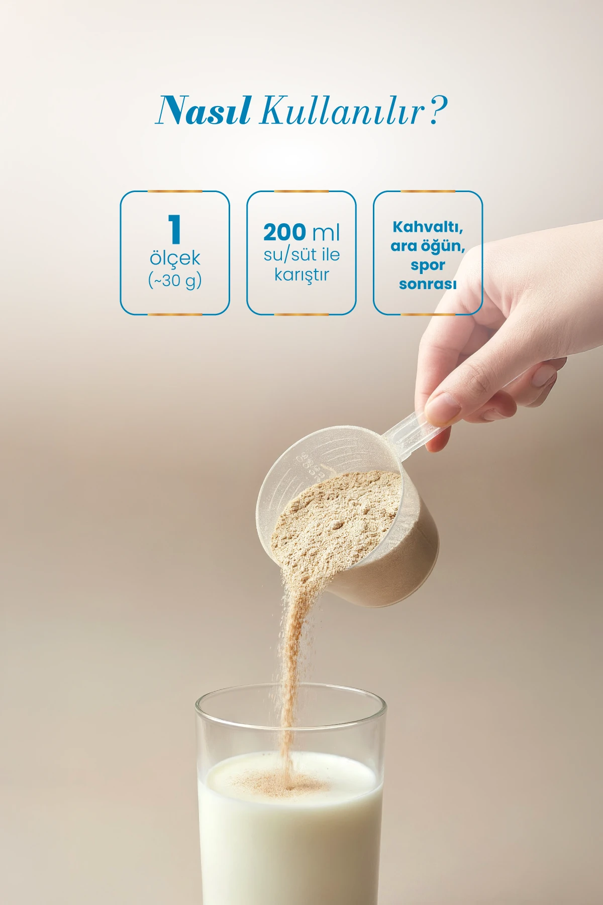 1. هر بار یک سروینگ (مثلاً 60 گرم پودر، مطابق دستور محصول) را در حدود 400 تا 500 میلی‌لیتر آب یا شیر کم‌چرب حل نمایید.